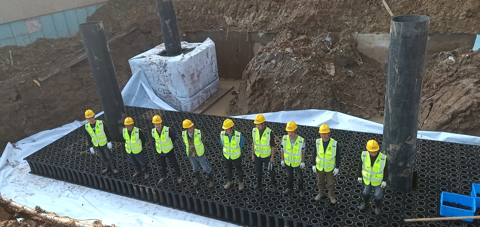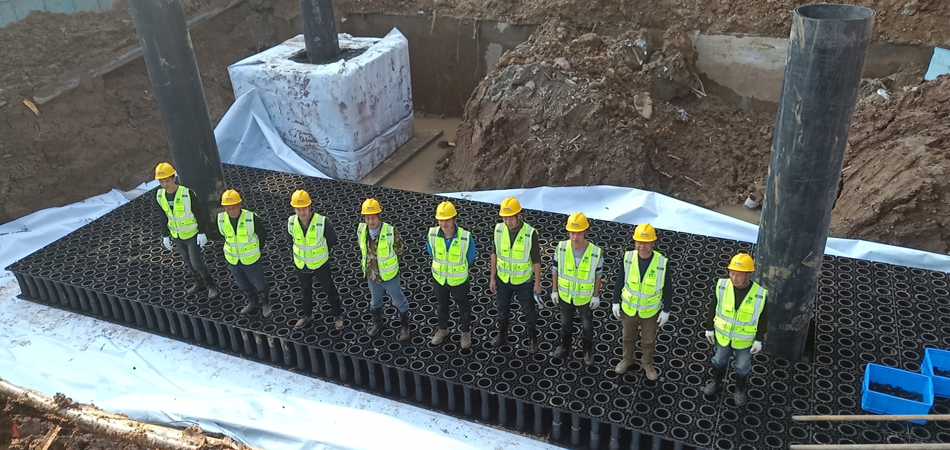 該項目雨水收集系統(tǒng)采用地埋PP模塊組合水池的方式收集雨水,前期經(jīng)過截污掛籃、棄流過濾,后期通過地埋一體機過濾,消毒,最終使水質(zhì)達(dá)到規(guī)范標(biāo)準(zhǔn),用于廠區(qū)綠地的澆灑,景觀補水,道路沖洗等。